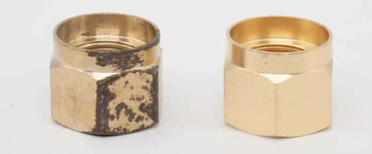 客户对这款产品既心动又有些疑虑,毕竟关系到生产流程的重大调整。为了让客户彻底放心,美贝仕邀请客户将样品寄到苏州相城区公司实验室进行测试。技术人员精心操作,将加温至45-50℃的抛光液准备好,把清洗好的黄铜双卡套弯头接头样品置于其中浸泡。仅仅1分钟后取出,用水洗净,此时接头表面已形成棕色透亮的氧化膜。接着,技术人员将其放入浓度为5%的硫酸溶液中浸泡约8-15秒,神奇的一幕出现了,表面的棕膜退净,接头呈现出令人惊叹的光亮,光亮度的效果远远优于客户之前使用的传统抛光工艺。