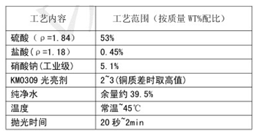 本产品采用优质进口表面活性剂、络全剂和酸雾抑制剂等复配而成。与传统产品相比,本产品克服了同类产品通用性不强、稳定性差、抛光效果不佳的缺陷。可满足目前市场上99%的各类不同材质的铜合金酸洗抛光处理,,浸泡后快速的令工件光洁如新。本品具有配制方便、操作简单,溶液稳定易于维护,使用时不易产生黄烟的特点,能够有效去除附着在铜表面的氧化物、锈迹及轻度油污,达到颜色统一、光亮的目的。因此,本工艺是替代传统“三酸”酸洗工艺的最佳选择。